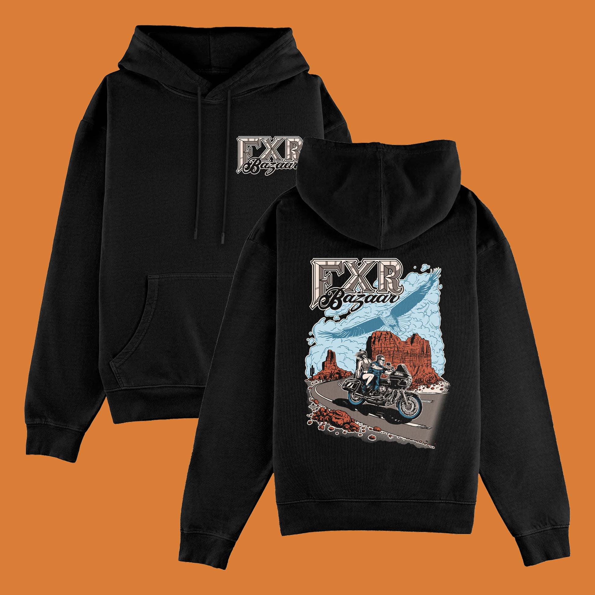 The Desert Canyon FXRT hooded pullover sweatshirt features a small front FXR Bazaar logo on the left chest and a large back design with an OG FXRT cruising 2-up through the canyons.