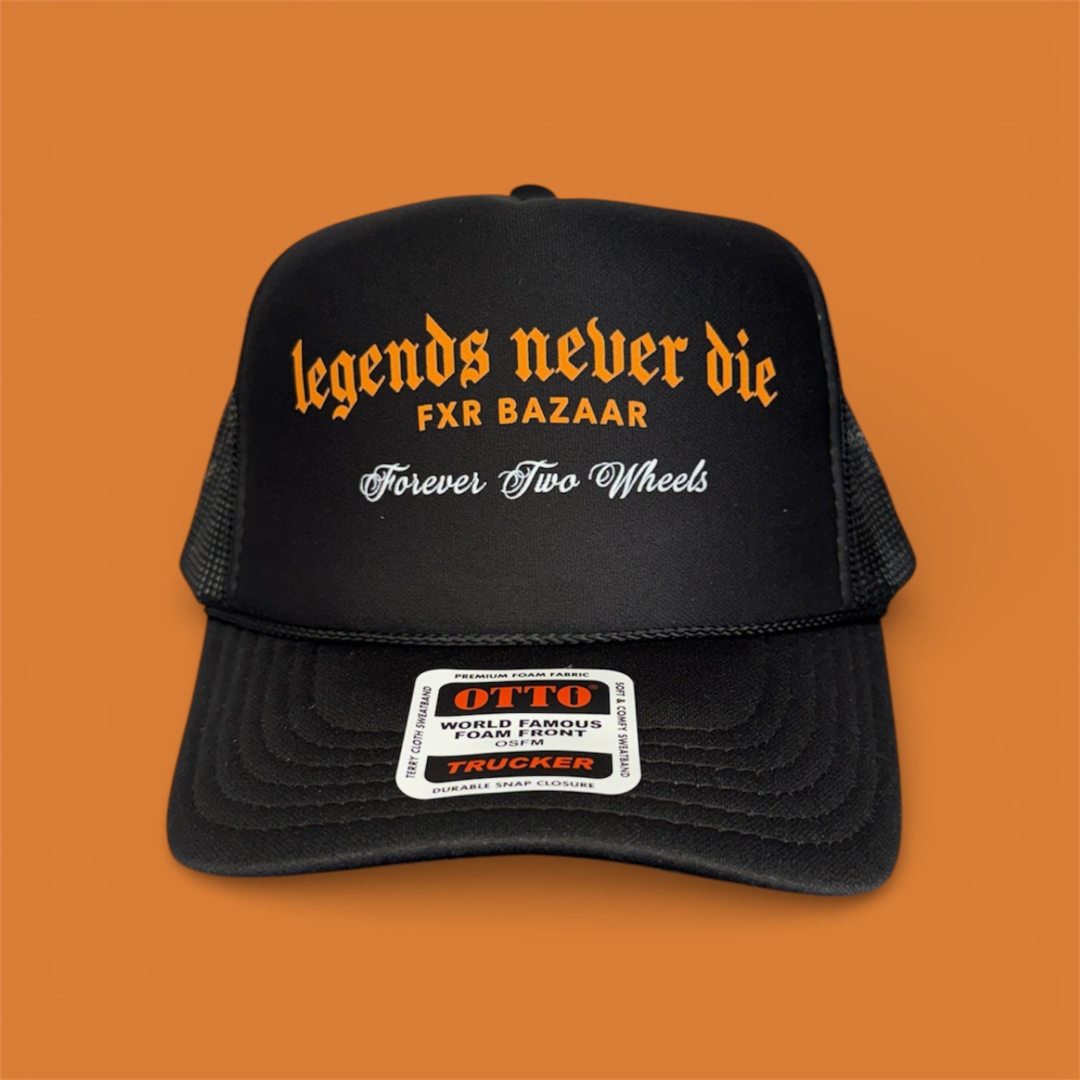 This FXR Bazaar classic trucker hat features a heat transfer of the phrase "Legends Never Die FXR Bazaar Forever Two Wheels" on the front of a high-quality 5-panel OTTO-brand trucker hat.